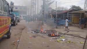 In a dramatic escalation of the ongoing land dispute, angry magazine workers at Tafo’s Newroad have destroyed and set ablaze a barricaded fence erected around their workplaces by an unidentified developer. This decisive action followed a visit to the Tafo Chief’s palace where Nana Agyen Asare publicly denied selling the land and threw his full support behind the aggrieved mechanics.