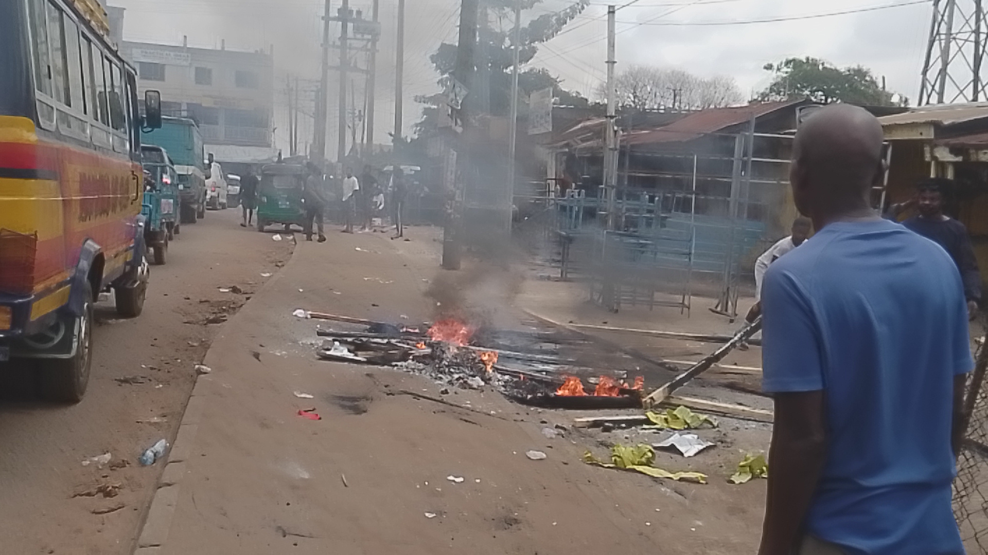 Angry Tafo Newroad mechanics destroy and burn barricade after the chief backs them in an eviction dispute: